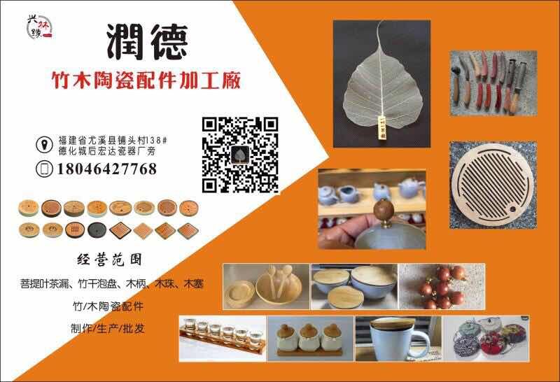 潤德竹木陶瓷配件加工廠專業生產制作:菩提葉茶漏、竹干泡盤、木珠、木塞、茶盤、茶道、六君子、木柄、杯墊、拉手、小五金等陶瓷器配件客服熱線:18046427768 微信:rd198955